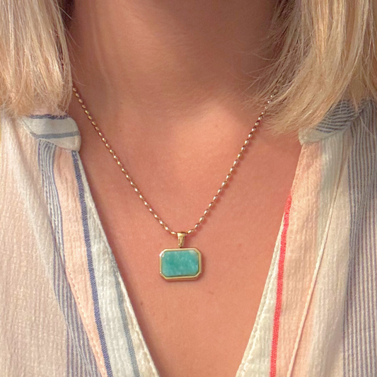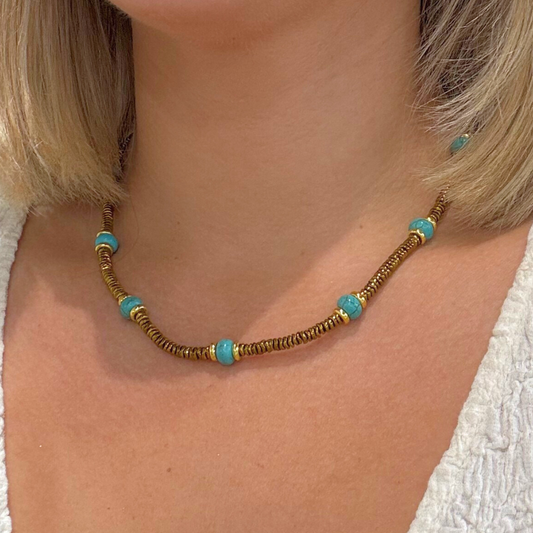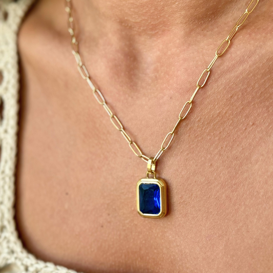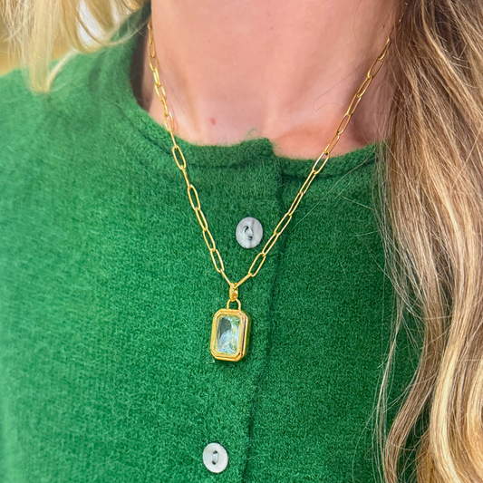 Gold Paperclip Chain with Cyan Colored Stone Necklace