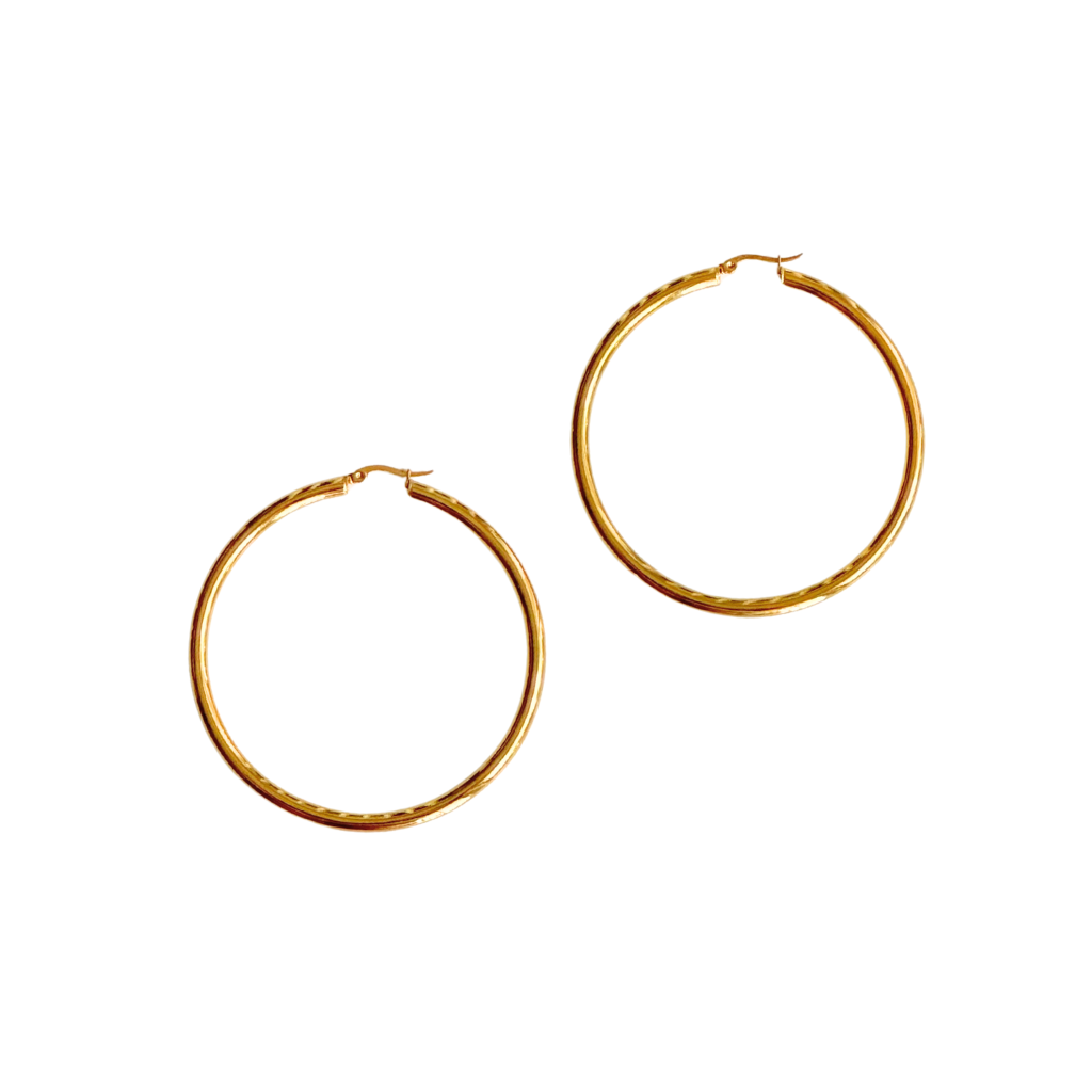 Elevate your style with these large 2.5" gold hoops, featuring 18kt gold plating over durable stainless steel. Designed to resist water and tarnish, they maintain their radiant shine, offering lasting elegance and effortless sophistication for any occasion.