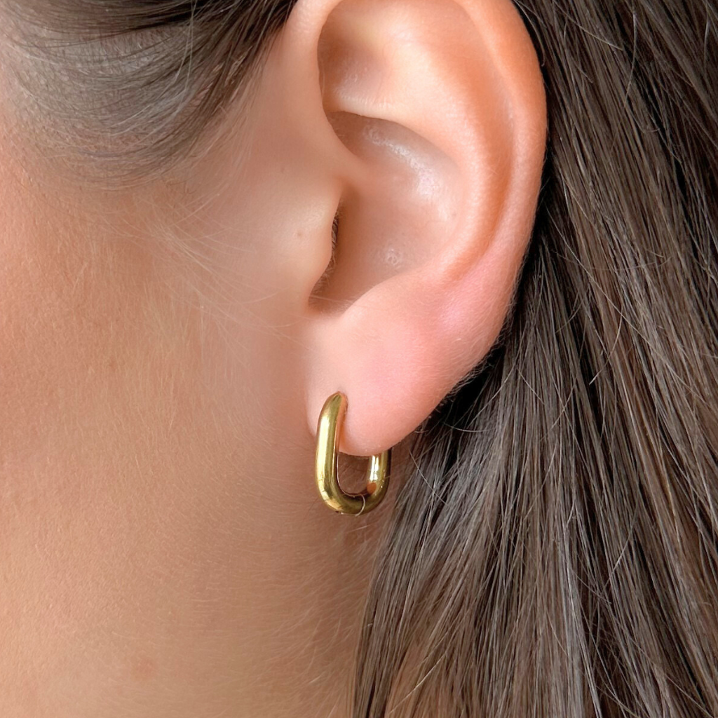 Delicate U-shaped huggies crafted with 18kt gold plating over a durable stainless steel base. These versatile earrings resist water and tarnish, making them perfect for everyday wear or special occasions. The refined design hugs the earlobe with understated elegance, offering a timeless addition to any jewelry collection.