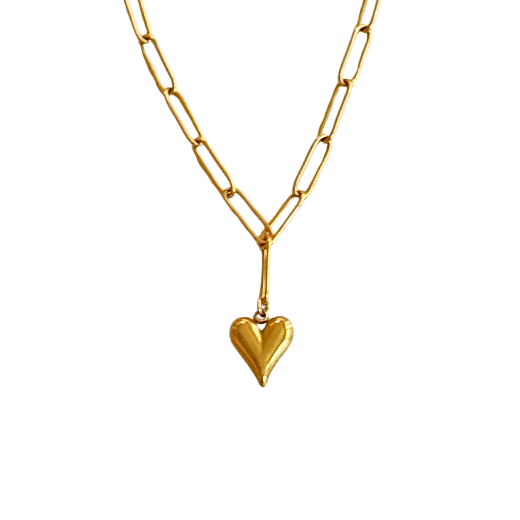 Elevate your style with this Gold Exaggerated Heart Paperclip Chain Necklace, featuring 18kt gold plating over durable stainless steel. Its water and tarnish-resistant finish ensure lasting brilliance, making it a refined accessory that complements any ensemble with timeless elegance.