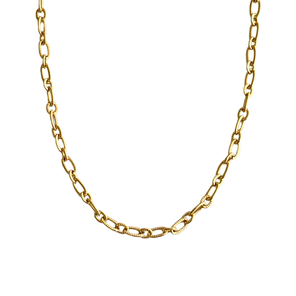 Go for gold with this quirky and stylish link necklace! Made with 18kt gold plating over stainless steel, it's both durable and trendy. Upgrade your jewelry game with this playful and unique piece.