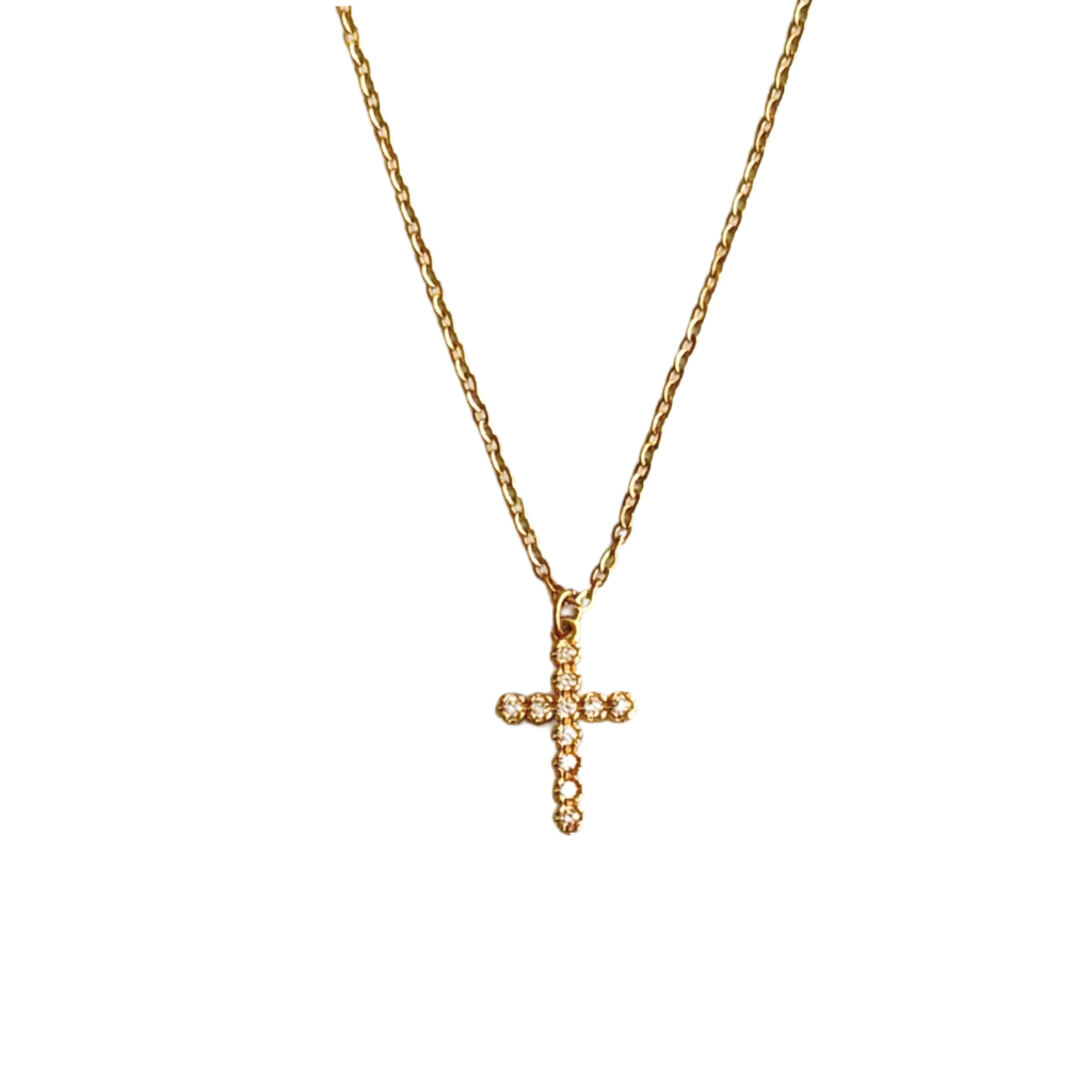 Shine bright with our Gold Cross Necklace adorned with sparkling cubic zirconia. Crafted with 18kt gold plating over stainless steel, this piece is water and tarnish resistant for long-lasting wear. Perfect to wear alone or layer it with other KMK styles for a unique look.