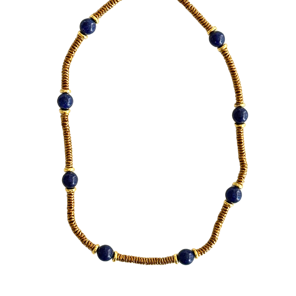 Elevate your elegance with this Gold Bead and Genuine Blue Lapis Station Necklace. Featuring 18kt gold plating over durable stainless steel, it offers lasting shine and resistance to water and tarnish. The genuine blue lapis stones add a rich, timeless touch, perfect for enhancing any refined ensemble.