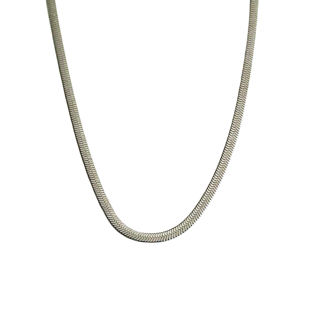 Elevate your look with this 4mm Silver Herringbone Chain Necklace crafted from durable stainless steel. Its water- and tarnish-resistant design ensures lasting shine and effortless maintenance. Perfect for wearing alone as a sleek statement or layered elegantly with other Kiss Me Kate necklaces for a personalized touch.
